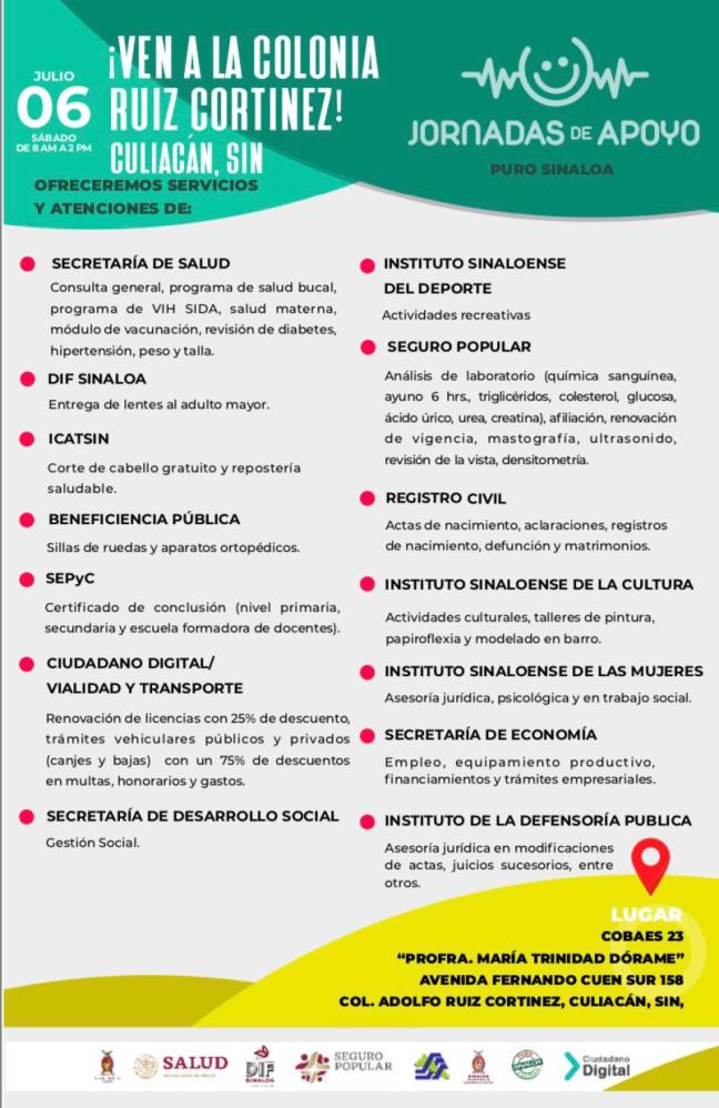 Culiacán, Sinaloa. En la segunda vuelta de las Jornadas de Apoyo ‘Puro Sinaloa’ por todo el estado, este sábado llegarán de nuevo al municipio Culiacán, donde se espera atender a poco más de 2 mil asistentes en la colonia Ruiz Cortinez.