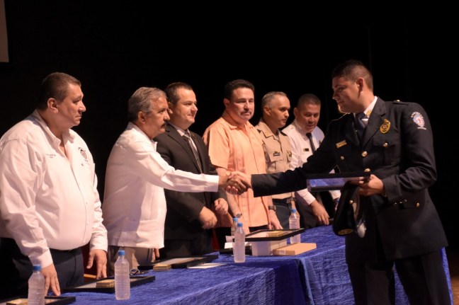 En la ceremonia, llevada a cabo en el Instituto MIA, el presidente municipal hizo entrega del reconocimiento “Bombero del Año”, en la categoría de clase y bomberos, a Juan Carlos Benítez González y Sergio Daniel Mercado Flores, respectivamente.