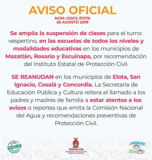 Culiacán, Sinaloa. En atención a las recomendaciones de prevención del Comité Estatal de Protección Civil y de la Comisión Nacional del Agua (CONAGUA), la Secretaría de Educación Pública y Cultura mantiene la suspensión de clases en el turno vespertino en los municipios de Mazatlán, El Rosario y Escuinapa y se reanudan en Elota, San Ignacio, Cosalá y Concordia.