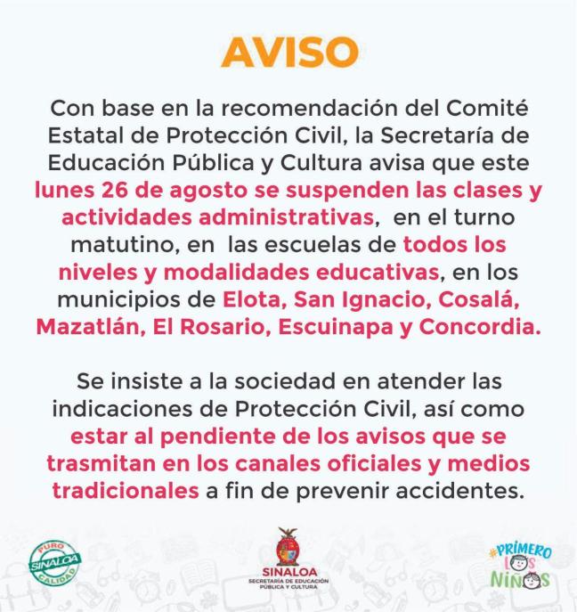 Culiacán, Sinaloa. Por recomendaciones del Instituto Estatal de Protección Civil de Sinaloa, la Secretaría de Educación Pública y Cultura (SEPyC) se suspenden clases y las actividades docentes, así como administrativas en el turno matutino en todos los niveles educativos y modalidades educativas en Elota, Cosalá, San Ignacio, Mazatlán, El Rosario, Escuinapa y Concordia, para este lunes 26 de agosto, ante el pronóstico de lluvias muy fuertes para los municipios del sur del estado antes mencionados.