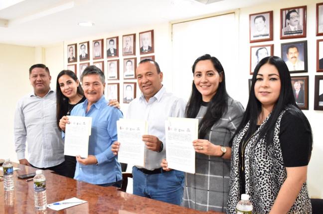 El alcalde Geovani Escobar Manjarrez y el director de la CVIVE, Salvador Reynosa Garzón, firman un convenio de colaboración para combatir el rezago en vivienda