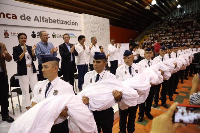 En el Polideportivo Juan S. Millán se llevó a cabo la ceremonia, en cuyo marco también se entregaron certificados de alfabetización y de conclusión de primaria y secundaria a adultos mayores, con lo cual Sinaloa mantiene un mínimo porcentaje de 3.1 por ciento en analfabetismo, por debajo del 4 por ciento requerido técnicamente para levantar la bandera blanca.