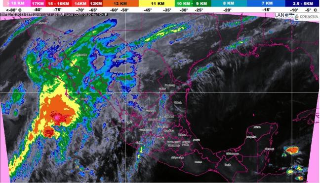 Lluvias muy fuertes a puntuales intensas (75 a 150 litros por metro cuadrado): Sonora, Baja California Sur, Chihuahua, Durango y Sinaloa.