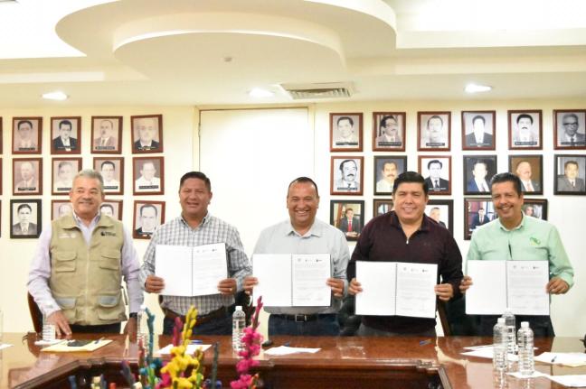 El alcalde Geovani Escobar Manjarrez y el director general del ISEA, Mario Valenzuela López, sigan un convenio de colaboración