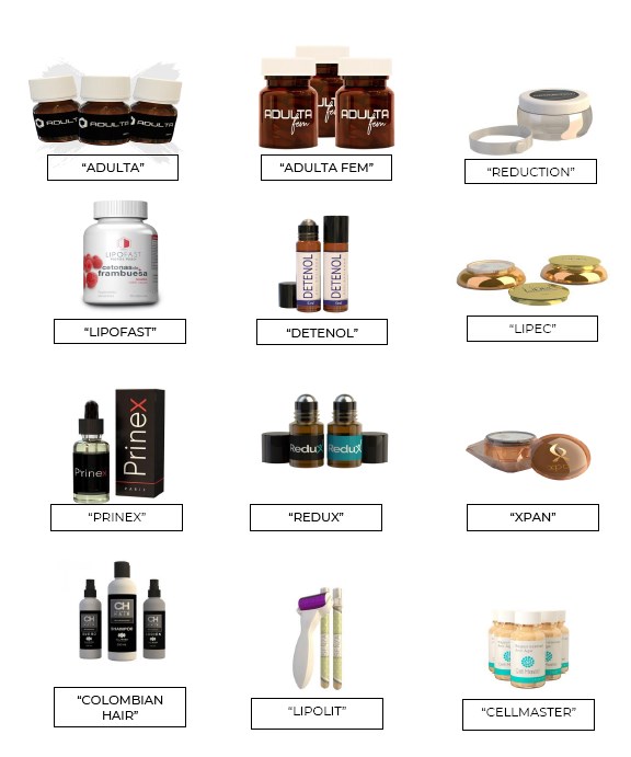 El reporte alerta específicamente sobre los productos Adulta, Adulta fem, Reduction, Lipofast, Detenol, Lipec, Prinex, Redux, Xpan, Lipolit, Senza y Dermaroller, Fillelin, Botolit, Colombian hair shampoo, Suero, Loción” y Cellmaster.