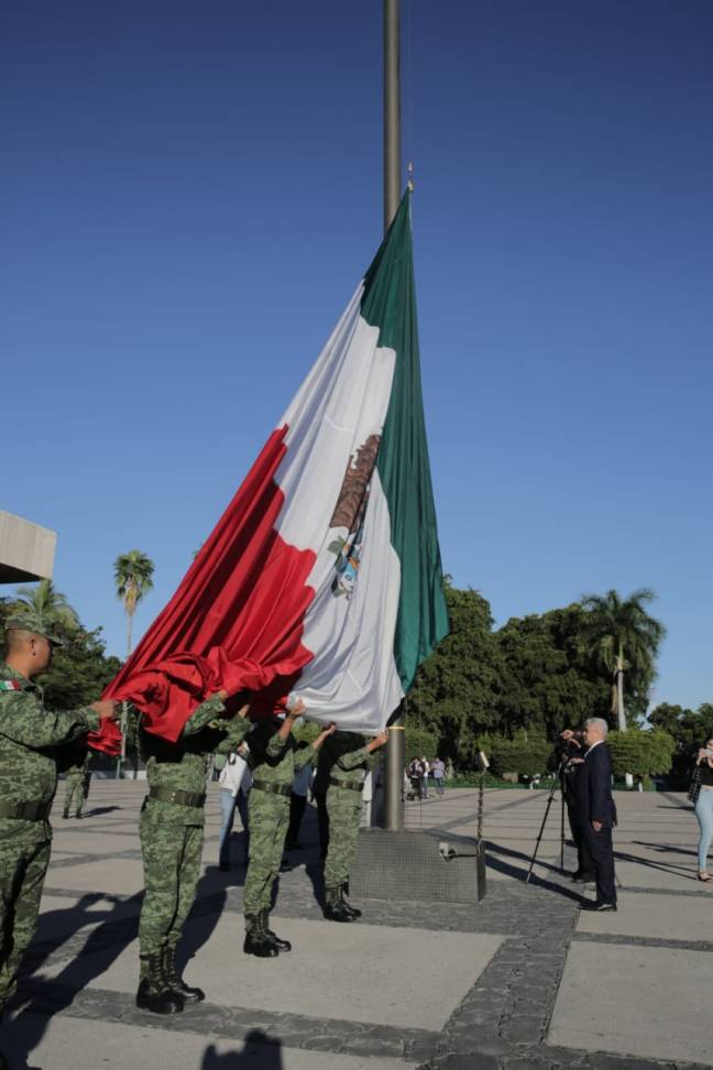 Correspondió al secretario de Seguridad Pública, Cristóbal Castañeda Camarillo, con la representación del Poder Ejecutivo, izar el lábaro patrio, en compañía de la diputada Gloria Himelda Félix Niebla, presidenta de la Mesa Directiva del Congreso del Estado; del Omar Jesús Abitia Salazar, magistrado del Supremo Tribunal de Justicia; y del secretario de Seguridad Pública y Tránsito Municipal, Oscar Guinto Marmolejo.