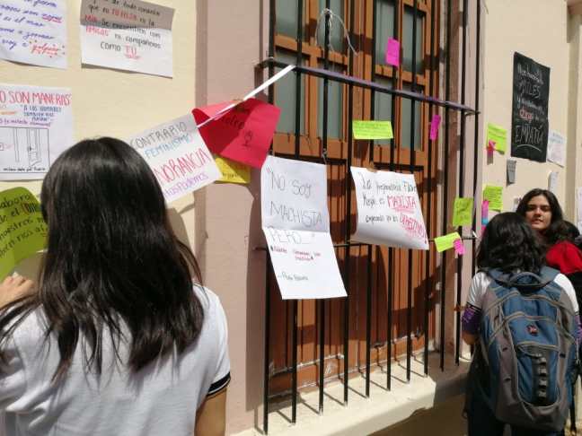 Las estudiantes instalaron cartulinas tanto dentro como fuera del edificio educativo, luego de que las autoridades les prohibieron ingresar a los medios de comunicación para ocultar el hecho. Y con señalamientos en éstas que fueron desde “Vengo a la escuela a estudiar, no a ser acosada”, “No expliques con manzanas lo que tienes que decir con huevos”, “Mis Ojos están arriba profe”, cubrieron las paredes.