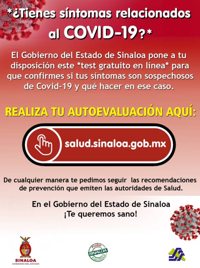 Detalló que, se trata de un “auto test”, el cual permitirá mantener informada a toda la población acerca del COVID – 19, sobre todo en cuanto a la preocupación de que si portan o no la enfermedad, pues este se encontrará disponible en línea en la página; http://www.salud.sinaloa.gob.mx.