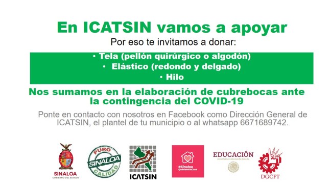Quienes se quieran apoyar con el material antes mencionado pueden contactarse a través del Facebook en la página Dirección General de ICATSIN o al WhatsApp 6671 689742 o en el plantel ICATSIN de su municipio.