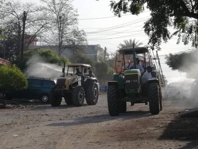 Del taller municipal ubicado en Villas del Río partieron los tractores facilitados por módulos de riego y Maquinarias del Humaya, a bordo de los cuales los trabajadores de la comuna realizan la sanitización con apoyo de aspersores.