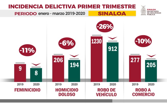 De acuerdo a cifras estatales, durante el primer trimestre del año, Sinaloa registró un decremento del 6 por ciento en homicidios dolosos, ya que de enero a marzo se presentaron 194 hechos, es decir, 12 menos que en el mismo periodo del 2019.