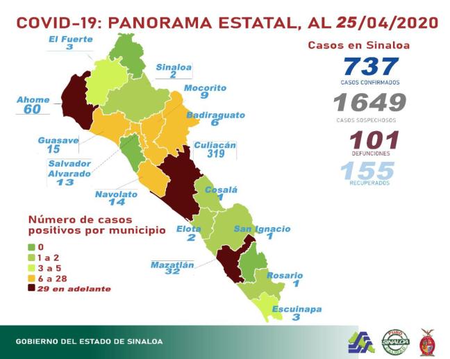 Recuperados: 155 (25 NUEVOS: 20 Culiacán, 3 Ahome, 1 Mazatlán, 1 Guasave)
