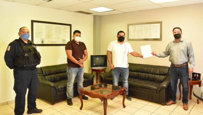 El secretario del Ayuntamiento, Víctor Manuel Cisneros Martínez, atendió a los representantes de las agrupaciones que solicitaron apoyo del Gobierno Municipal y Estado: Ángel Vega Flores, de Banda Cruz Sinaloense, y Rafael Zazueta Rodríguez, de Más Norteño Banda.