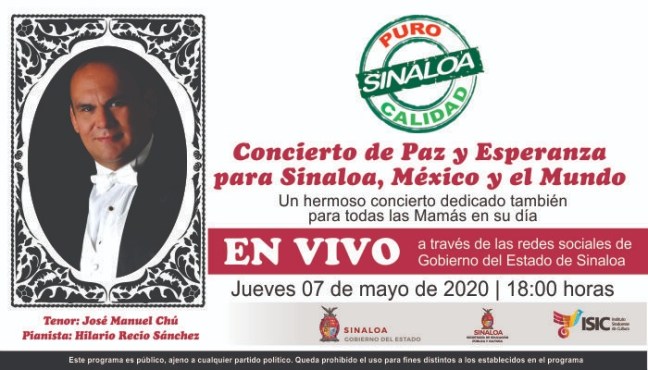 El Gobierno del Estado de Sinaloa, a través del Instituto Sinaloense de Cultura, invita a la ciudadanía a estar pendientes del “Concierto de Paz y Esperanza para Sinaloa, México y el Mundo”, que se transmitirá en vivo a través de las redes sociales de gobierno estatal, este jueves 07 de mayo las 18:00 horas.