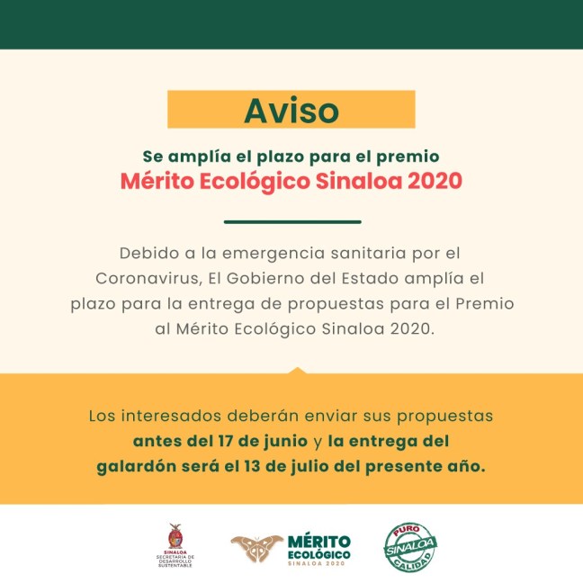 Culiacán, Sinaloa. Debido a la emergencia sanitaria por el Coronavirus, El Gobierno del Estado amplía el plazo para la entrega de propuestas para el Premio al Mérito Ecológico Sinaloa 2020.