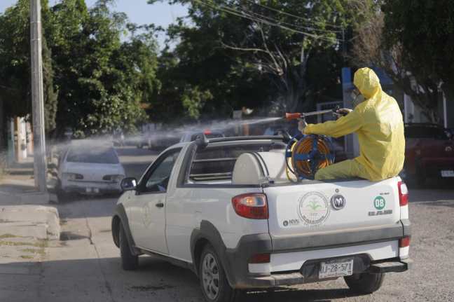 Desde muy temprano unidades y personal de sanitización del Cesavesin, Coepriss en conjunto con productores agrícolas quienes apoyaron con tractores y bombas, rociaron con una solución desinfectante las calles, banquetas, casas, escuelas, negocios, paradas de camiones y parques de este populoso sector.