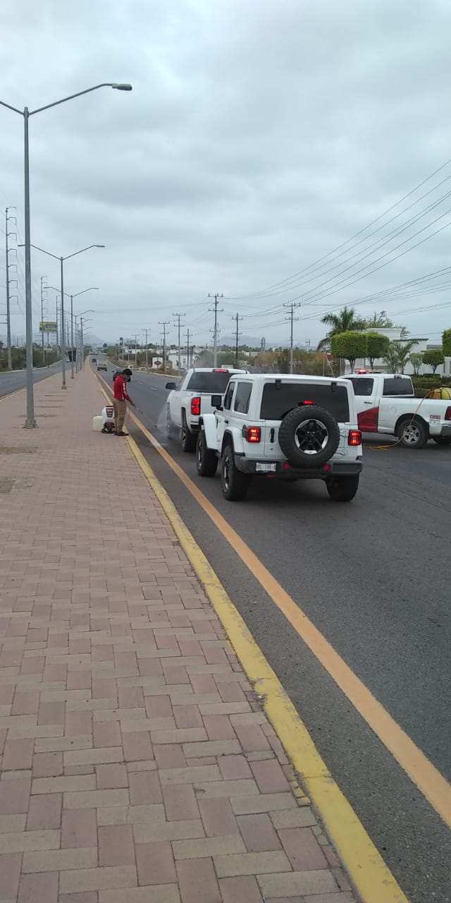 En el acceso vial ubicado al norte de la ciudad, personal del Gobierno de Culiacán vierte solución de cloro y detergente líquido en las unidades motrices que ingresan a la capital, desinfectando los vehículos y previniendo una posible propagación del virus.