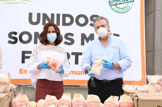 Culiacán, Sinaloa. En medio de la contingencia sanitaria por Covid-19 y como un gran acto de responsabilidad social la reconocida empresa de cobertura nacional Bachoco entregó a la presidenta del Sistema DIF Sinaloa, Rosy Fuentes de Ordaz y al secretario de Agricultura, Manuel Esteban Tarriba Urtuzuastegui, un donativo de 60 toneladas pollo, con ello se beneficiará a 40 mil familias sinaloenses.