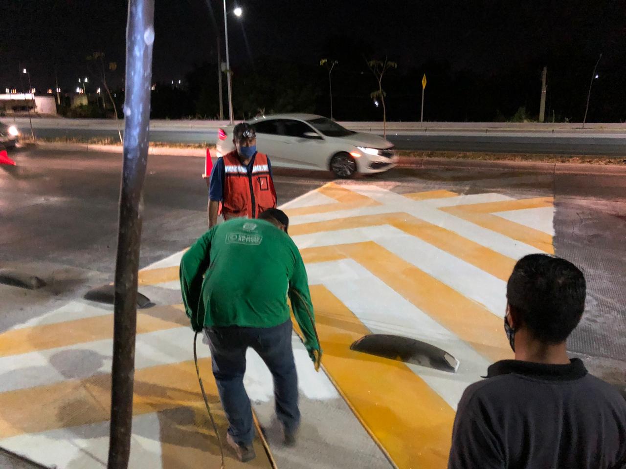 Realizan trabajos de pintura y mantenimiento en reductores de velocidad del bulevar Rolando Arjona