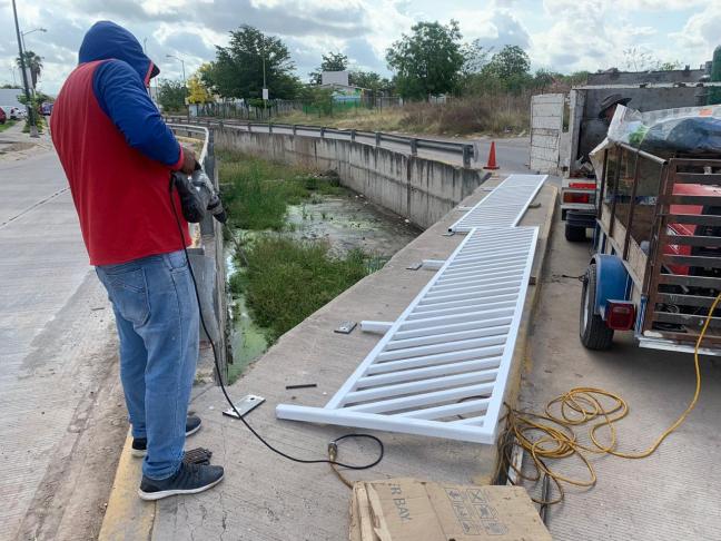 Personal de la Gerencia de Obras y Servicios Públicos llevó a cabo la instalación de barandales sobre el puente del arroyo pluvial ubicado en las inmediaciones del fraccionamiento Zona Dorada.