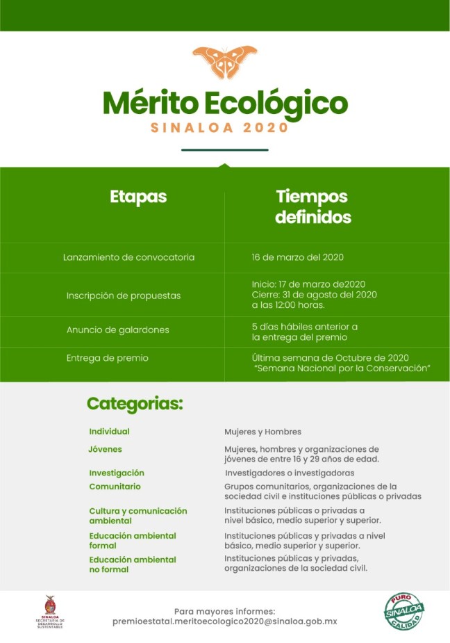 Culiacán, Sinaloa. Debido a la emergencia sanitaria por el Coronavirus, Gobierno del Estado determinó que la entrega del Premio al Mérito Ecológico Sinaloa 2020 será en octubre en el marco de la «Semana Nacional de la Conservación».