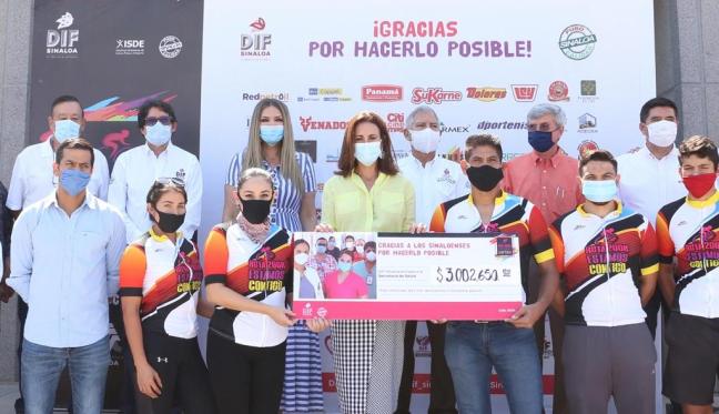 Culiacán, Sinaloa. Al cumplir el reto de la Ruta 200K y tras recibir una solidaria respuesta de la sociedad, la presidenta del Sistema DIF Sinaloa, Rosy Fuentes de Ordaz y la directora general Connie Zazueta, hicieron entrega al secretario de Salud, Dr. Efrén Encinas, lo recaudado durante la rodada, un cheque por la cantidad de 3 millones 2 mil 650 pesos.