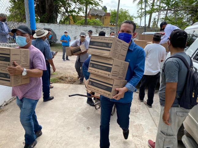 Sergio Torres, secretario de pesca y acuacultura, realizó gira de trabajo por las comunidades pesqueras de Teacapán, Escuinapa; Agua Verde y Los Pozos en el Rosario, junto con personal de DIF Sinaloa para hacer entrega de estos beneficios que surgen de inversión directa del gobierno de Quirino Ordaz Coppel, para apoyar al sector pesquero. En Escuinapa entregaron 2 mil 832 despensas enviadas por el Sistema DIF, que encabeza la señora Rossy Fuentes de Ordaz, así como hacer entrega del pago de empleo temporal estatal por el monto de Un millón 919 mil 274 pesos. Todo ello en beneficio de mil 416 familias. Ya en el municipio de El Rosario, en las comunidades pesqueras de Agua Verde y Los Pozos, pagaron empleo temporal por un monto de 3 millones 410 mil 236 pesos, a la vez de dar inicio a la entrega de 5 mil 32 despensas destinadas a beneficiar a 2 mil 516 familias de pescadores de esta zona. Sergio Torres señaló a los pescadores que estos recursos se hacen posibles gracias al gobernador del estado y su esposa, presidenta del sistema DIF Sinaloa, para apoyar a las familias del sector pesquero durante la temporada de veda de pesca de camarón y otras especies.