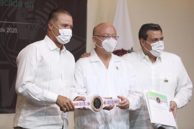 Culiacán, Sinaloa. El gobernador Quirino Ordaz Coppel encabezó la ceremonia donde el presidente del Consejo Mundial de Boxeo (CMB), Mauricio Sulaimán Saldívar, entregó a la Universidad Autónoma de Sinaloa y al párroco del Tempo de Nuestra Señora del Carmen en Culiacán, presbítero Miguel Ángel Soto Gaxiola, el Cinturón Mazahua “Héroes de México WBC”, al mérito humanístico por la labor destacada en la lucha contra el COVID 19.