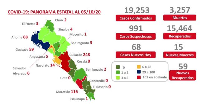 Muertes 3,257 (15 nueva Culiacán 7, Mazatlán 3, Ahome 2, Guasave 1, Mocorito 1, Escuinapa 1)