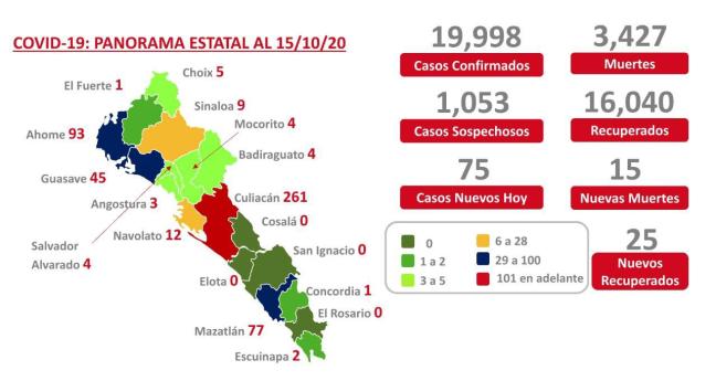 Muertes 3,427 (15 nuevas. Culiacán 9, Ahome 3, San Ignacio 1, El Fuerte 1, Mazatlán 1)