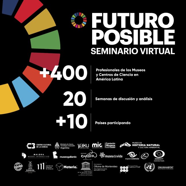 El Seminario Virtual “Futuro Posible” es un espacio inédito de colaboración y actualización virtual sobre la agenda 2030 para el campo museístico y educativo. Este propone un esfuerzo de reflexión y aprendizaje para los profesionales de museos con el respaldo de la Oficina de Ciencias de la UNESCO para América Latina y el Caribe, ONU Hábitat, ONU mujeres y Gobierno de Sinaloa entre otros