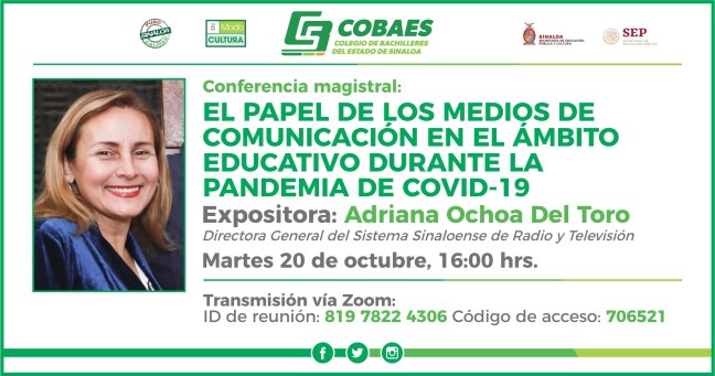 “La radio tiene un papel educador en su servicio a la población”, afirmó Adriana Ochoa del Toro, directora general de Sistema Sinaloense de Radio y Televisión durante la conferencia magistral, “El papel de los medios de comunicación en el ámbito educativo durante la pandemia de Covid-19”, dirigida a los reporteros juveniles y coordinadores de Redes Sociales de Cobaes.