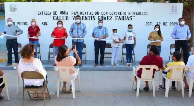 Navolato, Sinaloa. El presidente municipal de Navolato, Eliazar Gutiérrez Angulo, continúa apoyando a las familias navolatenses con obras y beneficios, y en esta ocasión acudió a la sindicatura de San Pedro para inaugurar la pavimentación con concreto hidráulico de la calle Valentín Gómez Farías, en la cual se realizó una inversión de 2´452,828 pesos, con recursos del Impuesto Predial Rústico.