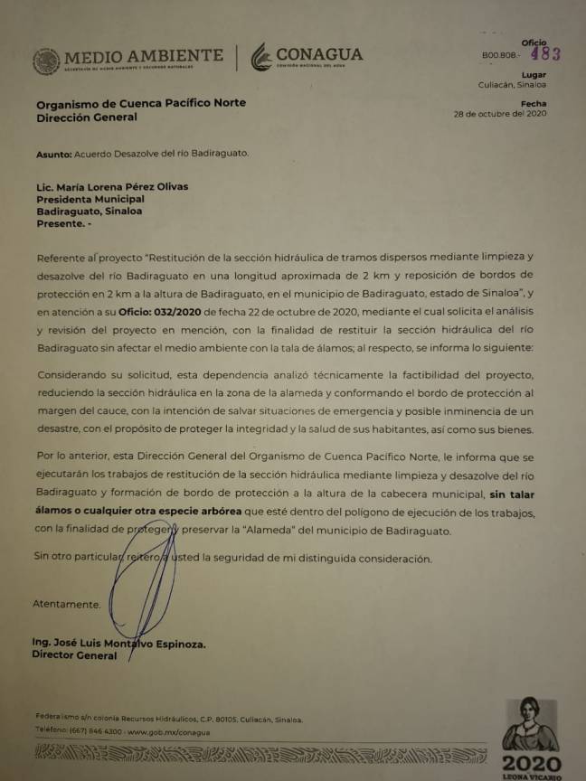 Badiraguato, Sin; las autoridades del gobierno municipal que encabeza Lorena Pérez Olivas recibieron un oficio por parte de la Comisión Nacional del Agua comprometiendose a llevar acabo la obra del dragado del río sin la tala de ningún arbol que se encuentre en el polígono del proyecto a realizarse.