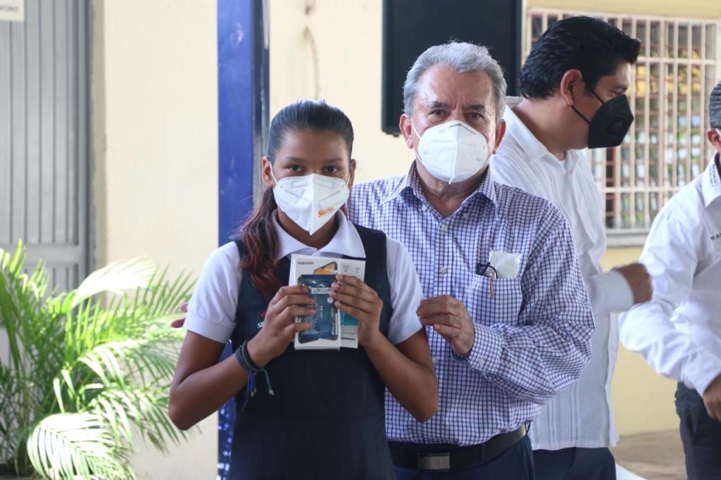 “El uso de un cubre bocas, de un gel, de un sanitizante y de la sana distancia es lo que nos ha permitido acudir hoy a ustedes, el objetivo es entregarles a los estudiantes de educación básica de preescolar, de primaria y de secundaria algo que les será de mucha utilidad: un celular o una computadora, que les permita recibir desde sus hogares la educación a distancia.