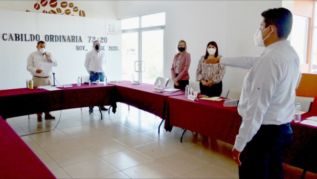 Navolato, Sinaloa. Luego de rendirle homenaje con un minuto de silencio al regidor José Carlos Trujillo García durante la sesión de Cabildo ordinaria 72/20, el presidente municipal de Navolato, Eliazar Gutiérrez Angulo, le tomó la protesta de ley a Martín Rosario Rubio Marín, como regidor suplente en funciones.