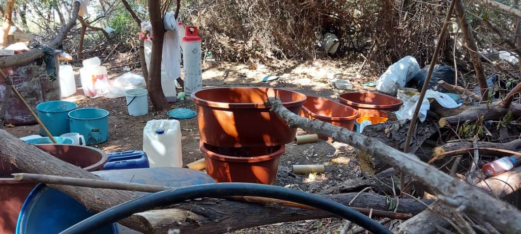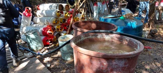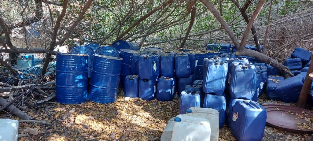 Durante un recorrido de prevención y vigilancia por la zona en un área enmontada y colindante a unas tierras de cultivo, se detectaron fuertes olores a químicos y se observaron algunos recipientes por lo que los elementos se aproximaron para verificar de qué se trataba.