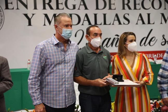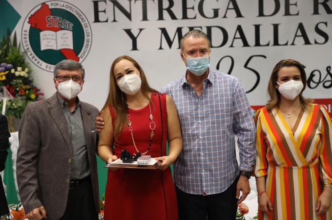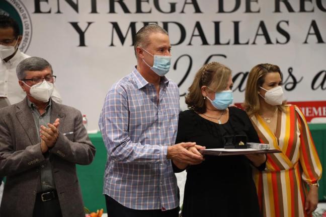Culiacán, Sinaloa. El gobernador Quirino Ordaz Coppel, acompañado por la secretaria General del Stase, Teresa Ochoa Pérez, entregó estímulos y medallas de manera presencial a 63 trabajadores al servicio del Estado, por sus 25 años laborados, donde destacó que con las reformas promovidas a la Ley de Pensiones, tendrán mayores beneficios en sus aguinaldos y pensiones, ofreciendo certeza jurídica y laboral.