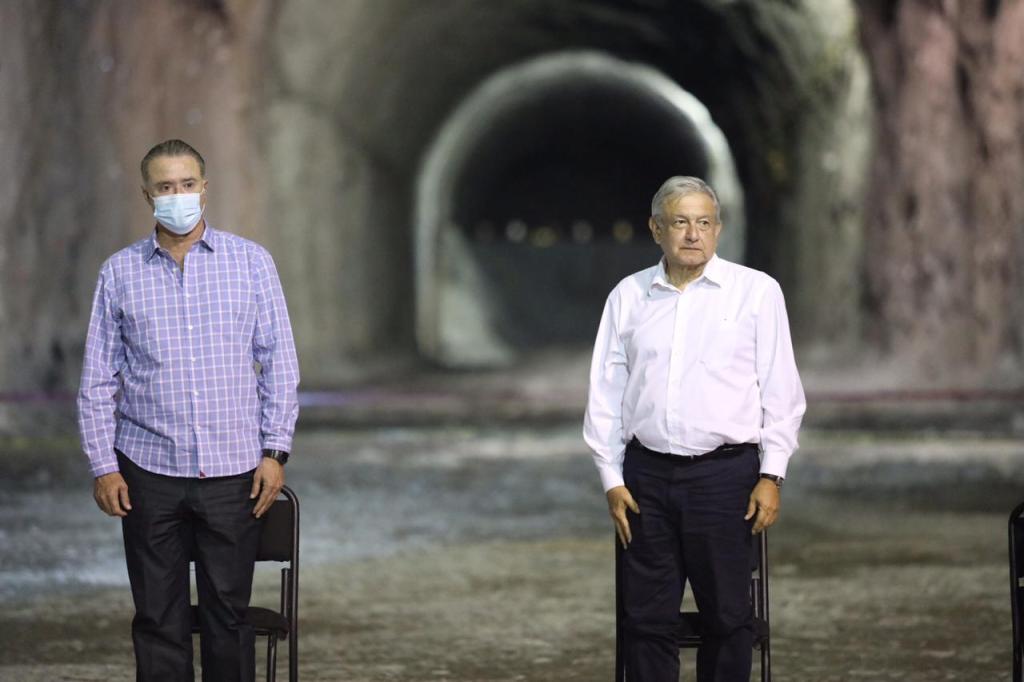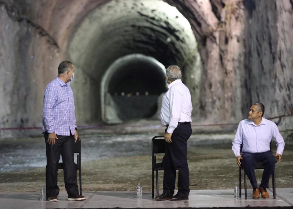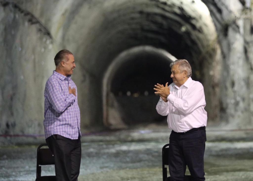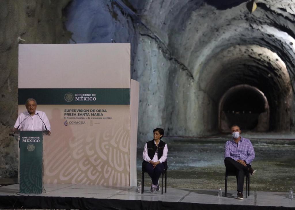 El mandatario estatal, junto con el presidente municipal de Rosario, Manuel Antonio Pineda Domínguez, recibió este viernes por la tarde noche al presidente de México, justo en uno de los tres túneles que conforman la estructura de desfogue de la presa Santa María, la cual hasta antes de paralizar los trabajos tenía un avance del 10 por ciento, con una inversión ejercida de dos mil millones de pesos desde el 2015, faltando por invertir 15 mil millones de pesos, mismos que garantizó el presidente Andrés Manuel López Obrador.