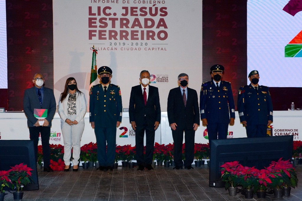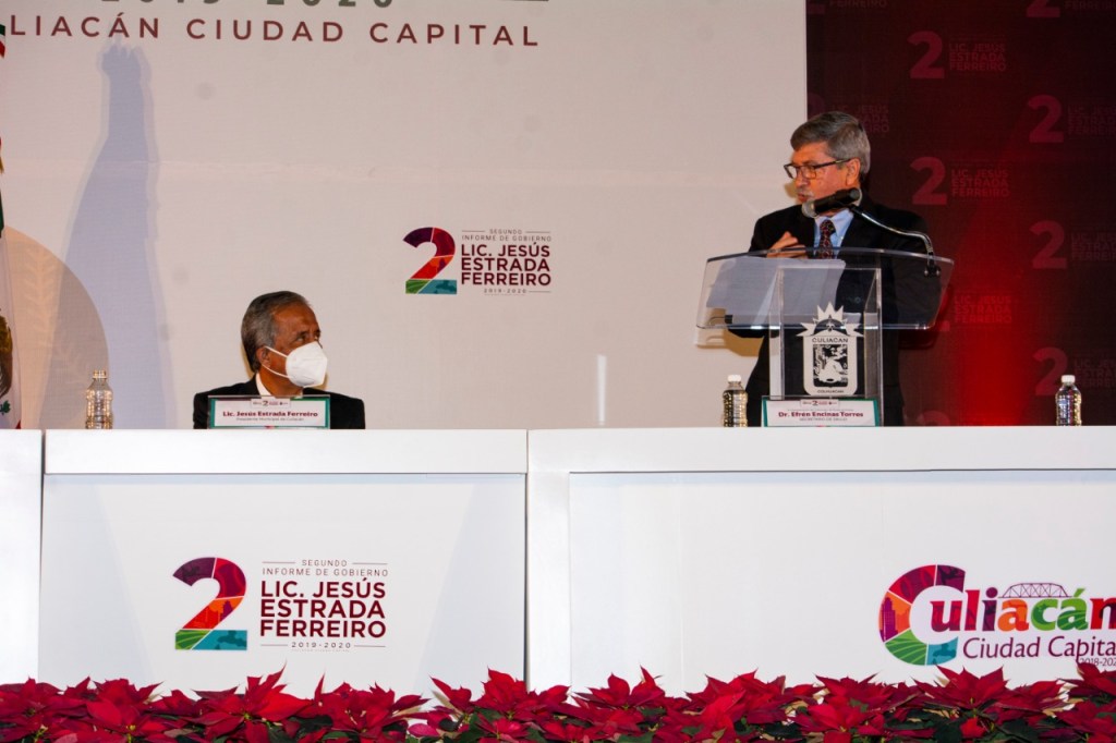 Conformaron la mesa del presídium, el secretario de Salud del Estado Efrén Encinas Torres quien recibió de manos del alcalde oficialmente el Segundo Informe de Gobierno en representación del gobernador del estado Quirino Ordaz Coppel, el general D.E.M. Maximiliano Cruz Ramos, comandante de la Novena Zona Militar, el jefe de Coordinación Estatal Sinaloa de la Guardia Nacional Juventino Longoria García en representación del Comandante de la Tercera Brigada de la Policía Militar Anastasio Santos Álvarez, el comandante de la Base Aérea Militar Número 10 con sede en Culiacán Juan Osuna González, y el secretario del Ayuntamiento Othón Herrera y Cairo Yarahuán.