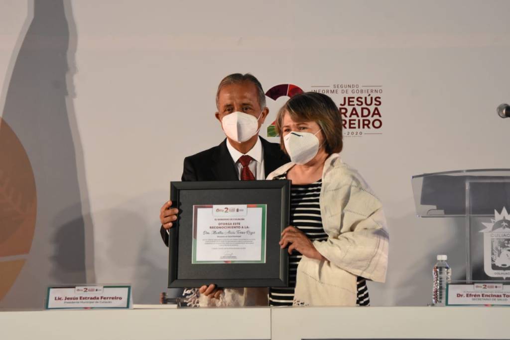 Cabe resaltar que el presidente municipal, hizo entrega de reconocimientos por trayectoria al Secretario de Salud del Estado Dr. Efrén Encinas Torres, Dra. Martha Alicia Torres Reyes Directora de Salud Municipal, Dra. Guadalupe Valenzuela Félix Especialista en Urgencias del Instituto Mexicano del Seguro Social, y al Dr. Edgar Urquídez Bazúa Neumólogo especialista del Área de Enfermedades del Hospital Angeles, quienes han desempeñado una noble labor en pro de la salud de los ciudadanos durante la actual pandemia.
