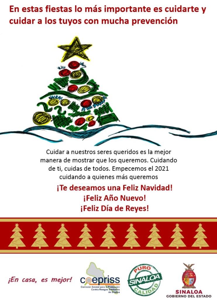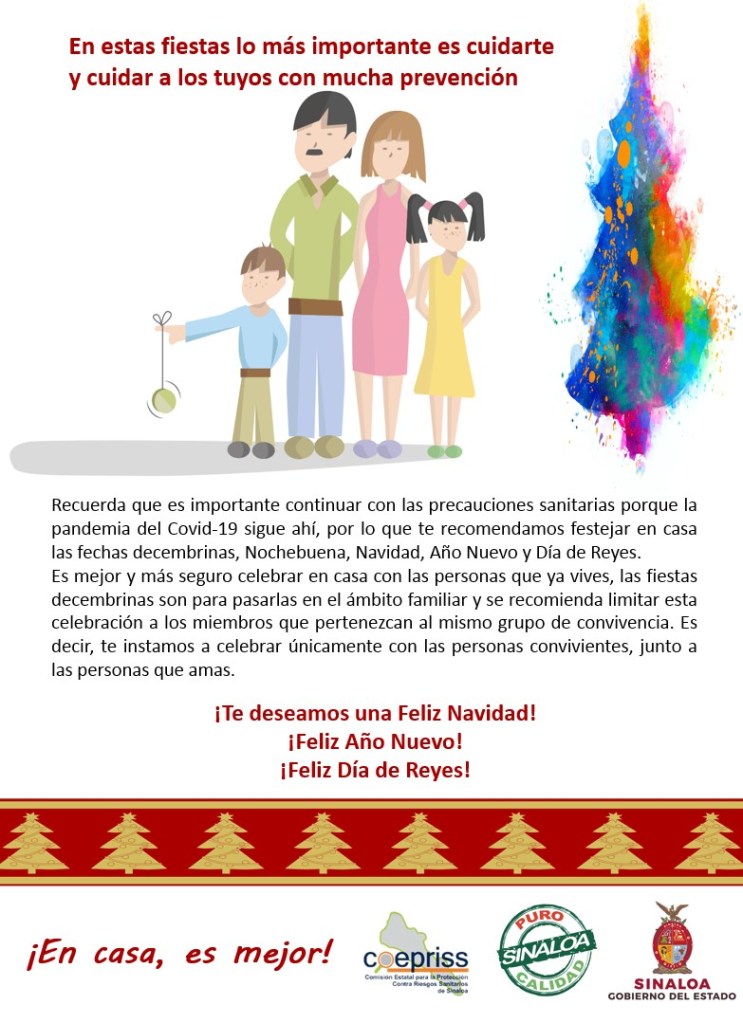 Culiacán, Sinaloa. La Comisión Estatal para la Protección contra Riesgos Sanitarios de Sinaloa (COEPRISS) lanzó la campaña «¡En casa, es mejor!» para sensibilizar y alertar a la población sobre los riesgos de bajar la guardia frente a la pandemia del Covid-19 durante las tradicionales celebraciones decembrinas y la recomendación de pasar estas fiestas en familia solo con las personas convivientes.