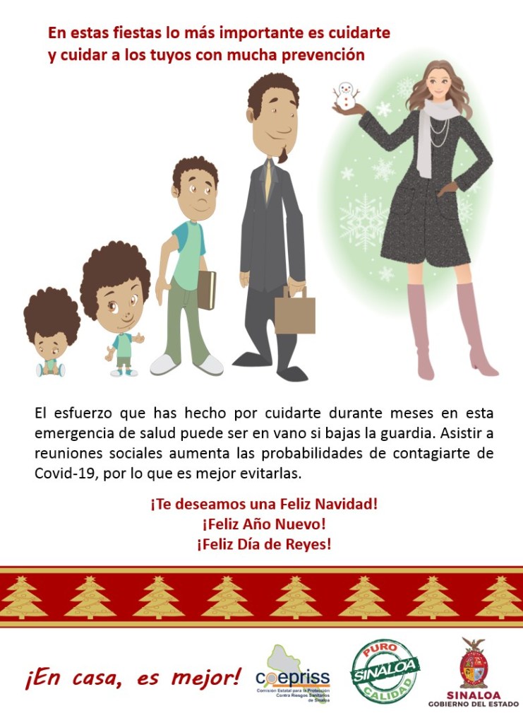 Por esta razón, explicó, la Coepriss ha lanzado la campaña «¡En casa, es mejor!» para alertar a la población que es indispensable mantener y fortalecer las medidas de prevención con la recomendación de pasar en casa estas celebraciones decembrinas, puesto que existen consecuencias y un peligro real de relajar estas precauciones durante estas fechas tan especiales.