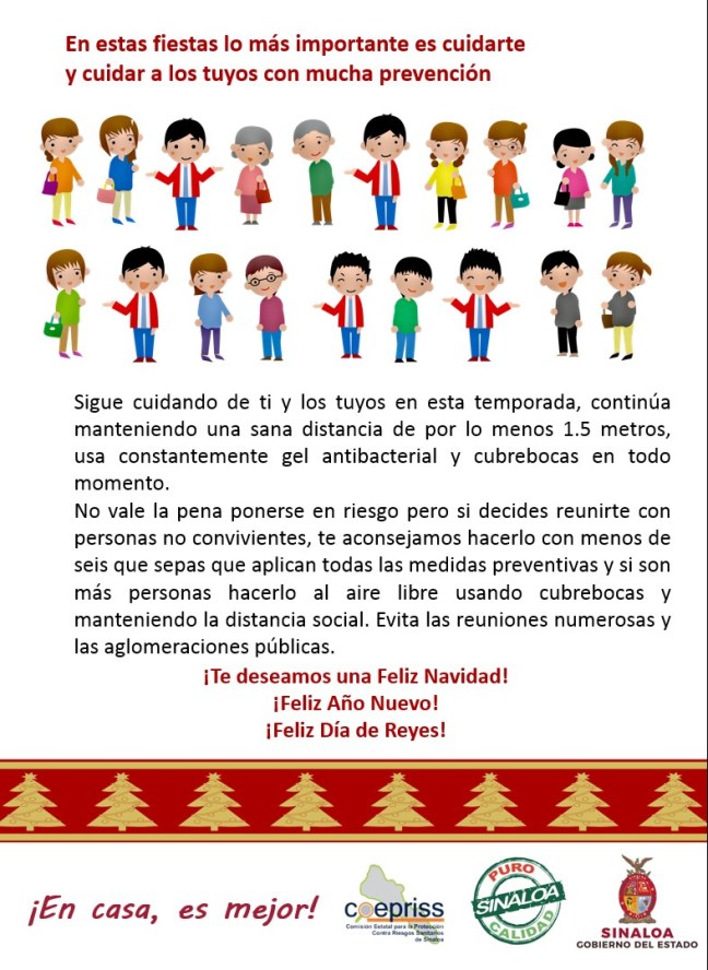 Por esta razón, explicó, la Coepriss ha lanzado la campaña «¡En casa, es mejor!» para alertar a la población que es indispensable mantener y fortalecer las medidas de prevención con la recomendación de pasar en casa estas celebraciones decembrinas, puesto que existen consecuencias y un peligro real de relajar estas precauciones durante estas fechas tan especiales.