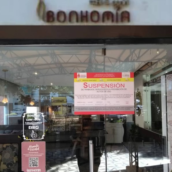 Los sellos de suspensión fueron colocados en el Restaurante Café Bonhomía Sucursal Las Quintas ubicado por Boulevard Sinaloa 730 luego de que un ciudadano registrara en video las deficientes condiciones de los sanitarios.