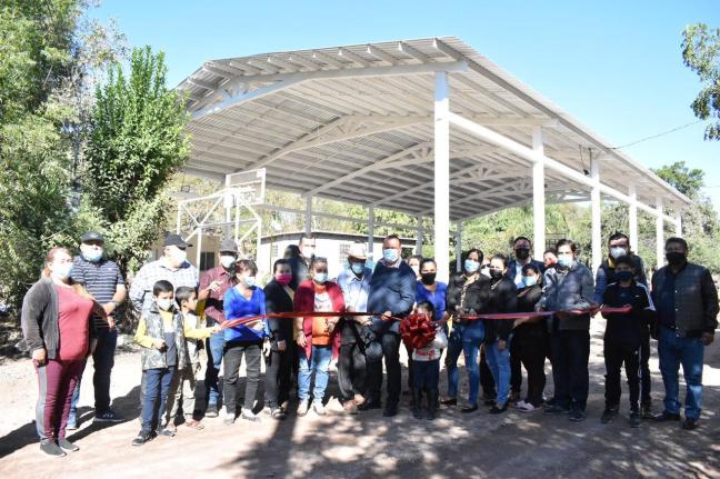 La Cruz, Elota, Sinaloa.- Autoridades municipales hicieron realidad un compromiso plasmado con los habitantes de la comunidad de Los Mecates, llevando a cabo el corte de listón inaugural de la construcción de una techumbre metálica en la cancha pública de este poblado.