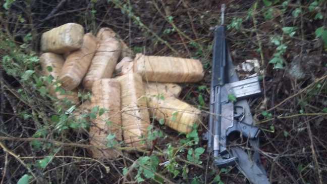 Derivado de un operativo de vigilancia y prevención en la zona serrana del municipio en mención, los elementos se trasladaban a bordo de unidades oficiales por un camino de terracería en un área enmontada cuando entre la maleza observaron varios paquetes encintados con una sustancia con las características de la droga conocida como mariguana y un arma larga.