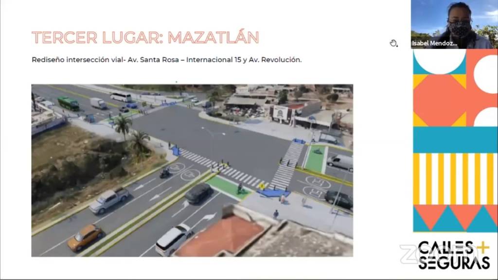 La secretaria de Desarrollo Sustentable dijo que el tercer lugar de este concurso lo obtuvo Mazatlán con el rediseño de intersección de avenida Santa Rosa- Internacional México 15 y avenida Revolución, que otorga mejores espacios a los peatones y la accesibilidad para todas las personas, además se aprovechan los áreas ociosas para crear nuevos espacios públicos que sean aprovechados por la población.