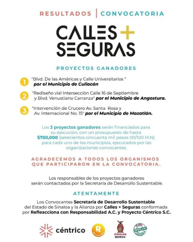 Culiacán, Sinaloa. De Culiacán, Angostura y Mazatlán son los proyectos ganadores del concurso «Calles Más Seguras Sinaloa», organizado por la Secretaría de Desarrollo Sustentable y la Alianza Global por la Seguridad Vial, través de Céntrico y Refleacciona A.C.