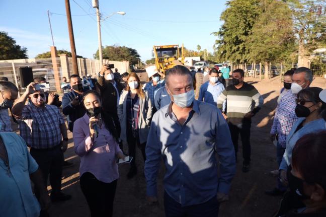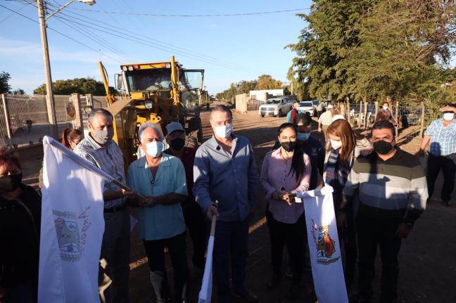El mandatario estatal arribó en compañía de la presidenta municipal, Aglaee Montoya Martínez, y del secretario de Obras Públicas, Osbaldo López Angulo, para poner en marcha la pavimentación de esta avenida de mil 150 metros de longitud, donde se invertirán nueve millones de pesos, con lo que cumple su compromiso, pues previamente se colocó la tubería de conexión con el dren para evitar más inundaciones.